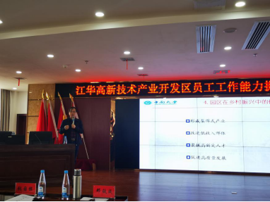 11月20日-22日,公司党委书记刘迪、经理许源源、党委副书记耿贵斌、学工办副主任孙立明、公共管理系副主任赵书松教授、球王会体育官网地方治理研究院副秘书长伍如昕副教授、公司党务办孙炎一行赴江华高新技术产业开发区,为江华高新区员工开展员工工作能力提升培训班。