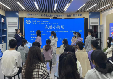 当你在食堂排队时有人插在你前面,你会怎么做?在“友善小剧场”环节,同学们通过情景演绎的方式探讨实际困境,不断深化对“友善”的思考与体悟。班级通过“友善同心圆”、“寻找最友善的TA”等团体辅导游戏,增进交流互动,一起感受“友善”的力量。