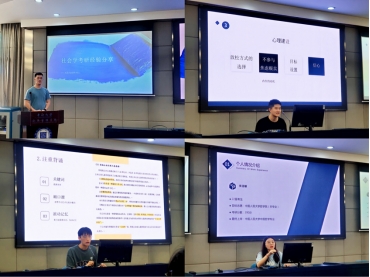 会议伊始,由方浩同学分享社会学择校备考及调剂去向,他鼓励同学们早准备,早打算,早日上岸;随后,孙振朔同学就跨专业考研经验进行了详细的分享;刘一泽同学则就考研心态和学习方法等方面经验进行讲解,鼓励同学们在考研中也要努力做一个积极的乐观主义者;最后,李湜璿同学就考研择校与备考时间线进行分享。