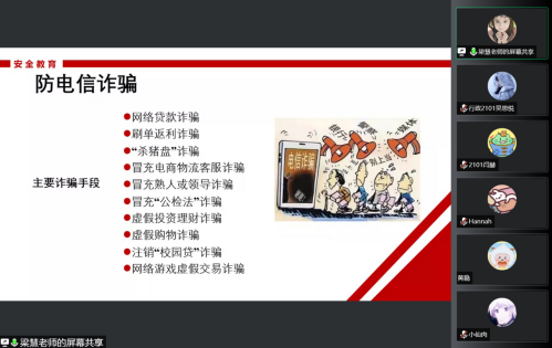 2022年9月28日晚上9时,我院安全教育主题线上年级大会召开。会议由本科生辅导员梁慧主持,公司19级与21级全体本科生参会。会议围绕防电信诈骗、交通安全、食品安全以及用电安全等四个方面对同学们进行提醒和要求。